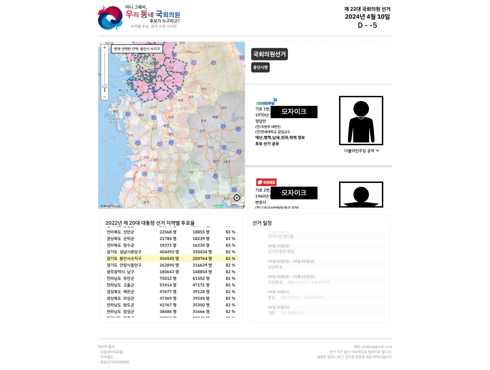 취미로 2024 대한민국 국회의원 선거를 앞두고 개발한 사이트다. 지도에서 지역을 선택하면 해당 지역의 국회의원 후보 및 정당 공약을 보여준다. 현재는 선거가 다 끝나서 사이트를 내린 상태다. 계속 올려두고 싶지만, 이게 선거기간이 끝나면 후보자 정보를 공개하면 안된다는 법이 있어서 내릴수밖에 없었다. 나중에 시간되면 후보자 정보를 더미데이터로 숨기고 사이트 모양만 남겨서 사이트를 살려볼까 고민 중이다.