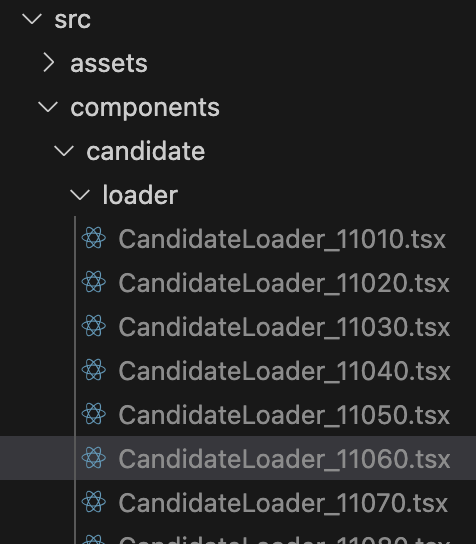 사이트는 리액트로 만들었다. 로직과 관련된 코드는 다 직접 작성했지만 (ChatGPT의 도움을 많이 받았다) 코드의 상당수는 파이썬을 이용해 생성했다. 각 지역별로 후보 정보를 로딩하는 loader 코드인데, 이를 손으로 작성할수는 없기에 파이썬으로 아래와 같은 코드를 생성해야했다. 이를 이용해 사용자가 특정한 지역을 클릭하면 해당 지역에 해당하는 후보자 json 파일을 로딩하는 방식이다.